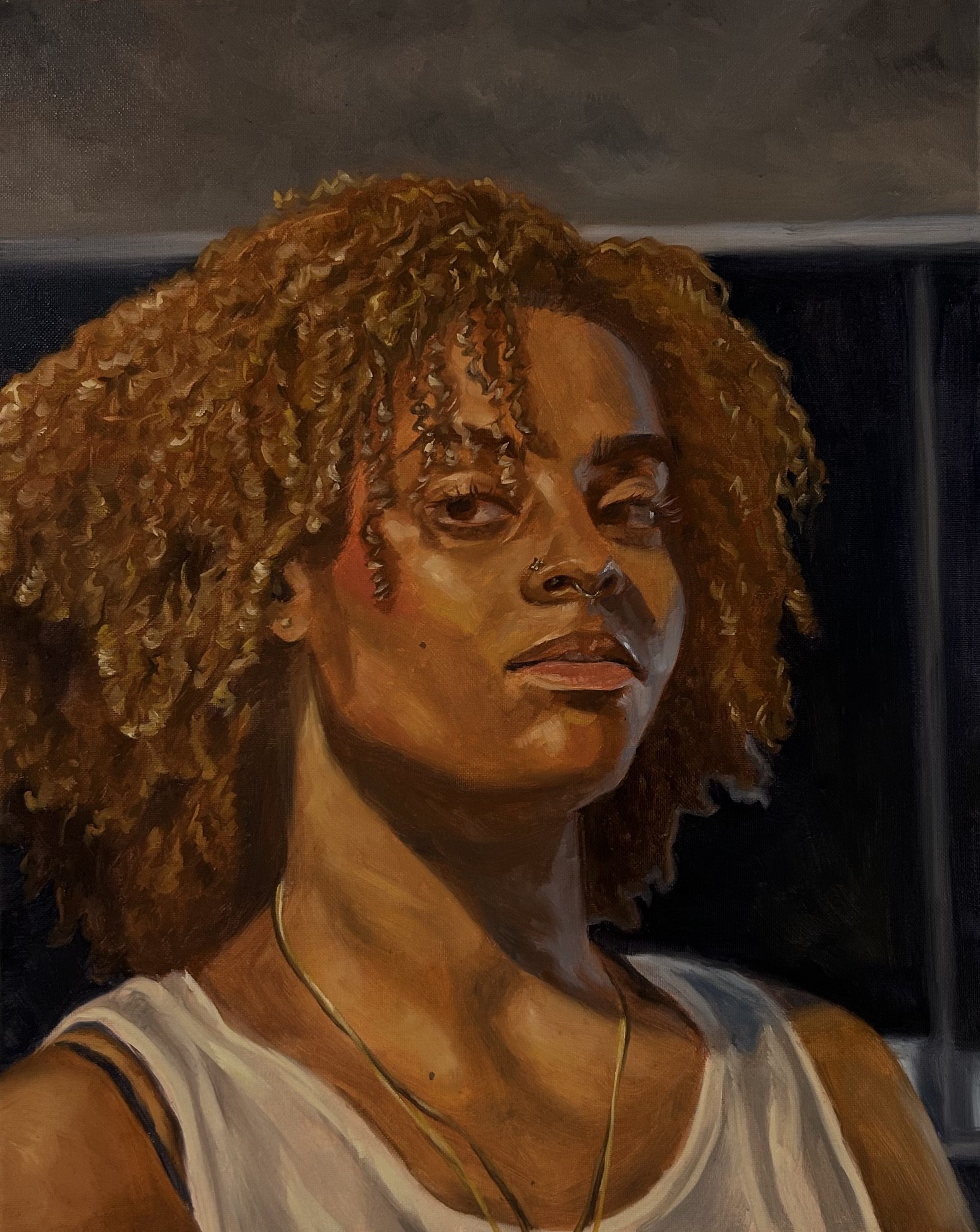 Framed, High contrast portrait of a figure partially hidden in a bush of Forsythia flowers. Done in oil on a 16”x20” canvas. Available to ship in June.